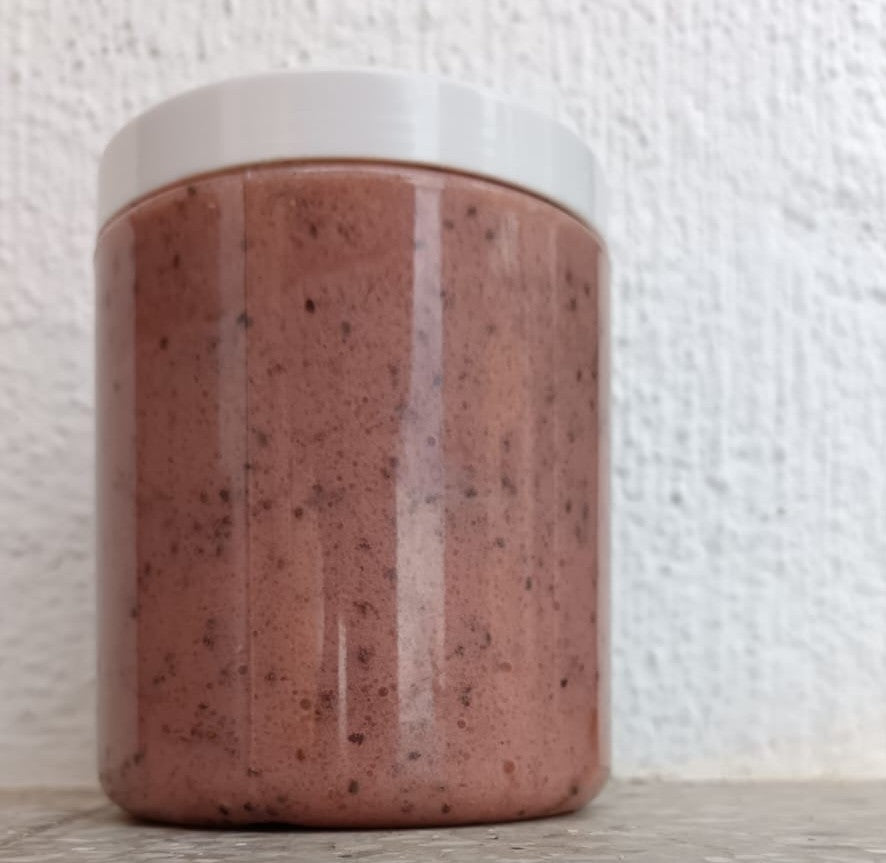 Jabón artesanal con aroma dulce y cremoso a fresa con leche, formulado con ingredientes exfoliantes y nutritivos que limpian en profundidad, eliminan impurezas y células muertas, dejando la piel suave, renovada y delicadamente perfumada.